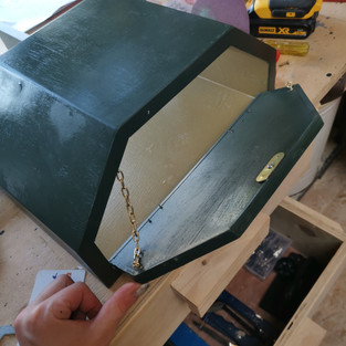 But after 10 breaths in and 10 breaths out we figured out how to fix it. It required carving out the edging, where the hinges where initially located. It took a while of hammering, but eventually I got the right depth, sand it down and sprayed it with green paint and it was ready to go! Even hinges fitted in nicely.. That's handy :D